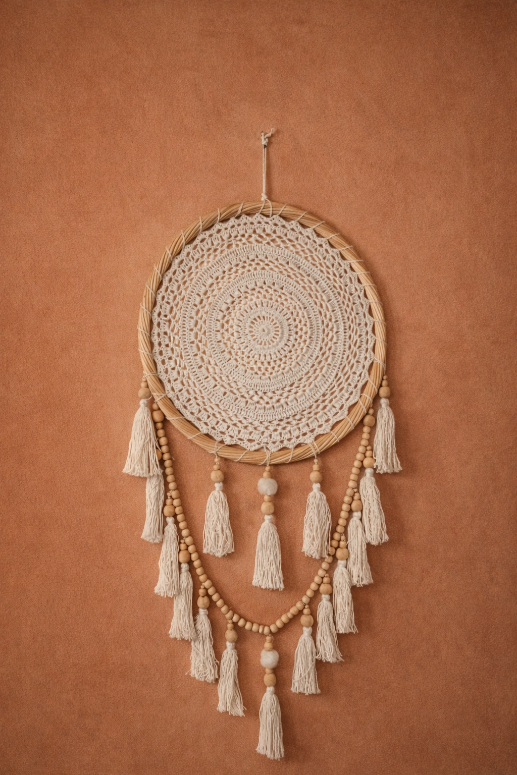 Chaque fil est noué à la main, révélant la précision du geste et la beauté des matières naturelles. Les pampilles en coton et les perles en bois apportent mouvement et douceur, créant une présence apaisante et authentique.