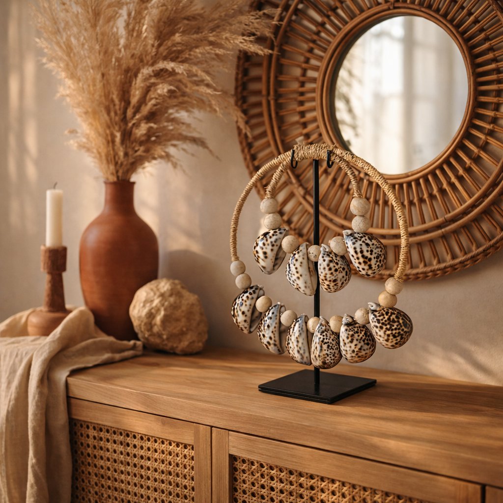 Inspiré des parures tribales d’Océanie et des îles du Pacifique, ce collier incarne la force des cultures insulaires et l’authenticité de l’artisanat balinais. Présenté sur son socle en métal ou accroché directement au mur, il devient un véritable objet décoratif ethnique, apportant une touche sauvage, solaire et exotique à votre intérieur.