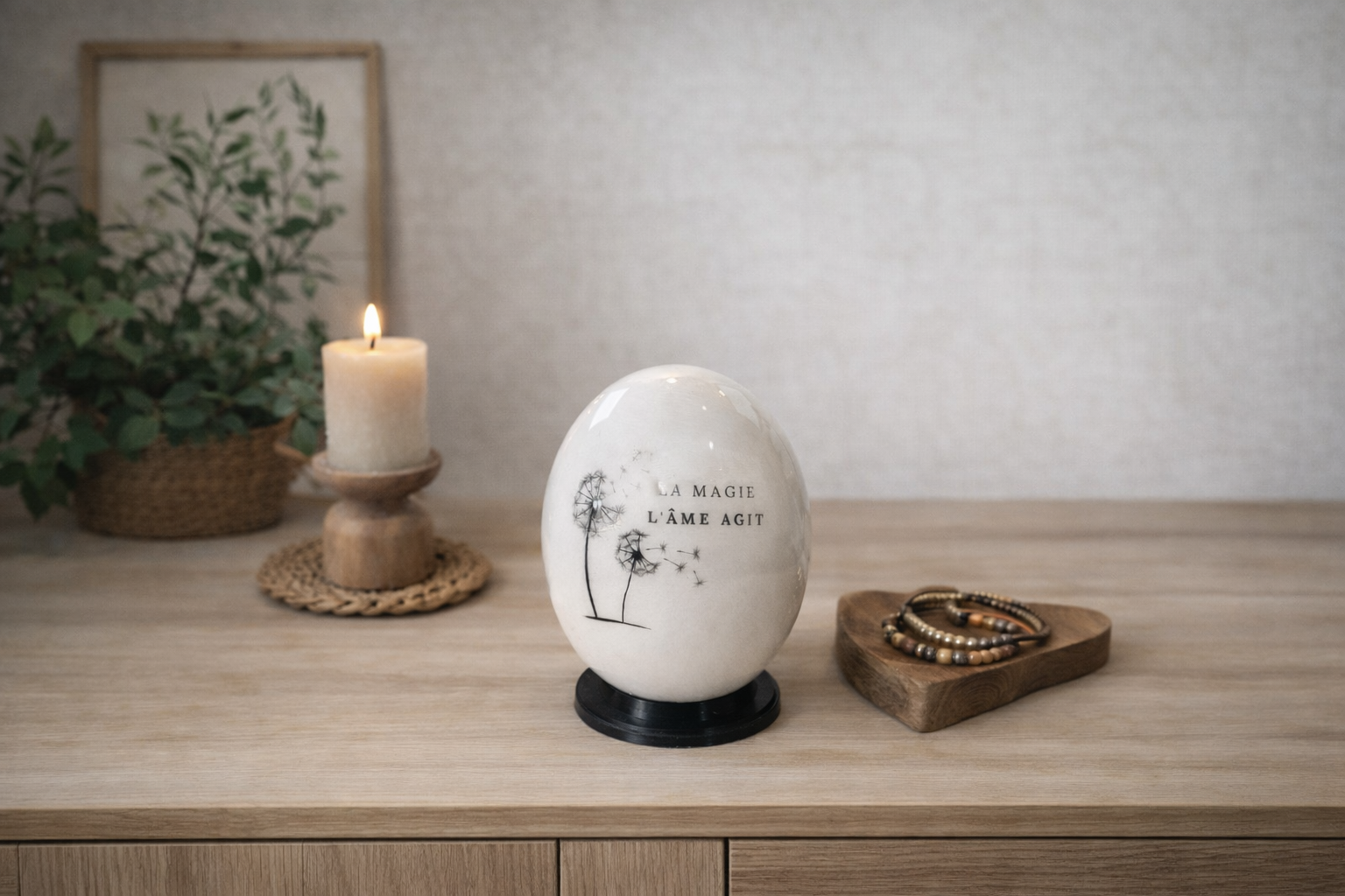 Sa surface naturellement ivoire est ensuite polie et protégée par un vernis léger, révélant la douceur et la subtilité de la matière. La gravure « La magie, l’âme agit » accompagnée de pissenlits délicatement dessinés vient sublimer la pièce sans altérer son authenticité.