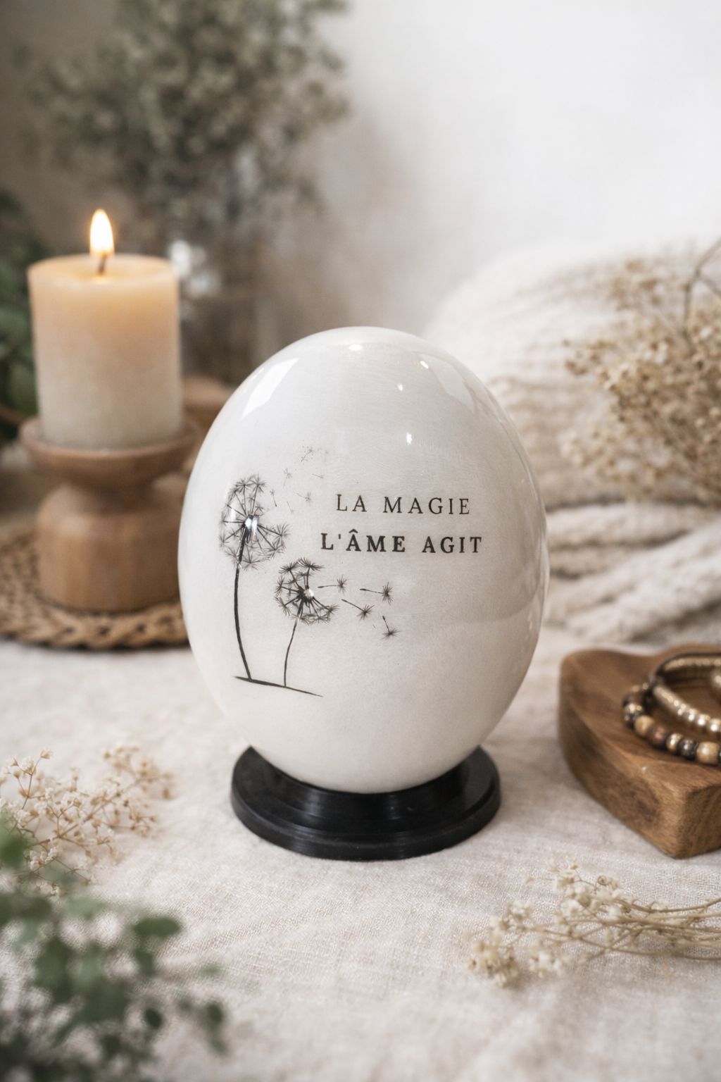 Objet décoratif à la fois poétique et symbolique, il trouve naturellement sa place sur une console, une étagère ou une table basse. Il apporte une touche douce, spirituelle et élégante à votre intérieur.