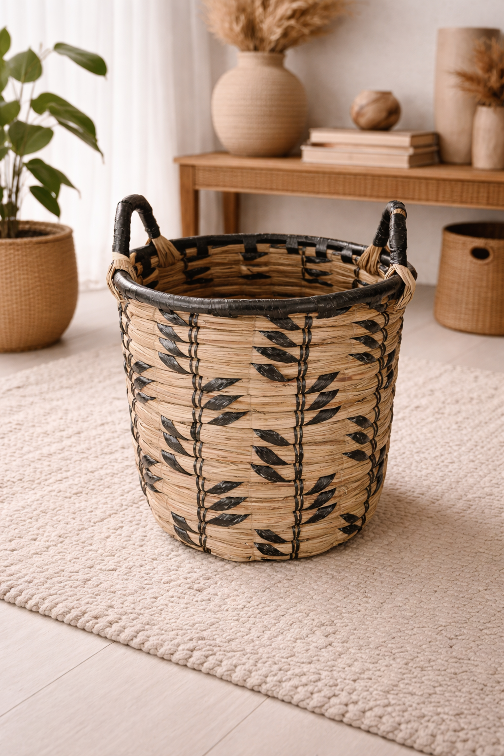 Sa structure est réalisée en fibres végétales naturelles soigneusement tressées à la main. Les motifs noirs, intégrés directement dans le tressage, sont réalisés à partir de fibres plastiques recyclées, apportant contraste et modernité tout en renforçant la structure.